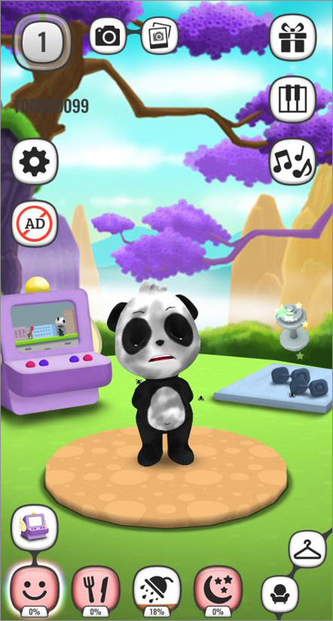我的会说话的熊猫是一款好玩有趣的休闲养成游戏,游戏画面精致细腻,主角熊猫黑黑的眼圈,憨态可掬的表情,游戏玩法和会说话的汤姆猫差不多,玩家要照顾好熊猫的饮食起居,给他刷牙、喂食、玩耍等。游戏中的小熊猫可以在玩家触摸时作出反应,还可以为它装扮,从各式各样的毛色、衣服、帽子和眼镜等的,搭配不同的服装。