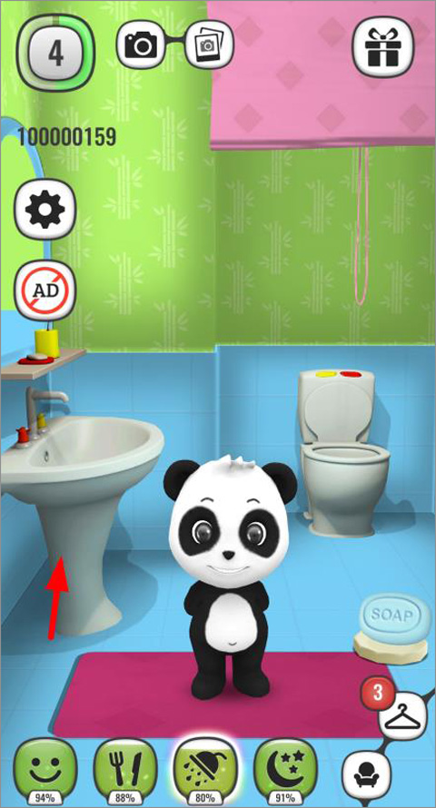 2、进入浴室后,点击右侧的香皂可以给小熊猫洗澡;
