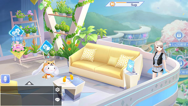 1、QQ炫舞手游主界面点击角色可以进入阳台,在这里玩家可以打开邮箱,同时还可以查看自己的送花与点赞。后面的花架还可以领取鲜花,赠送给自己喜欢的其他小伙伴,另外点击后面的花架,可以进入到花园种植鲜花。