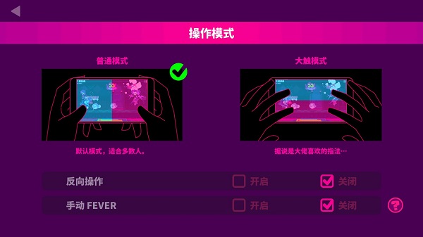 对于指法的选择,一定要慎重,因为一旦习惯了一种指法想再去换就会非常难受,怎么玩怎么别扭。在手机端的话一般是选择大触模式加交互指法的搭配,当然萌新模式加轮指也行(这种操作有点怪,很少有人这么玩)。如果你现在还在使用拇指单指操作,还是建议尽早练习多指操作,本人实际经历是拇指玩到7,8级曲就非常吃力了,9级曲基本没得玩。