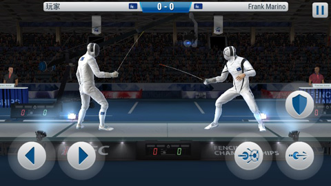 游戏的操作简单,采用的是虚拟按键,与横版格斗游戏类似:左侧箭头为控制运动员前后移动,右侧按键是弓步突刺、直刺和格挡等招式。玩家操控运动员与对手保持合适的距离,判断出招方式就能击中对手有效部位,获得比分。