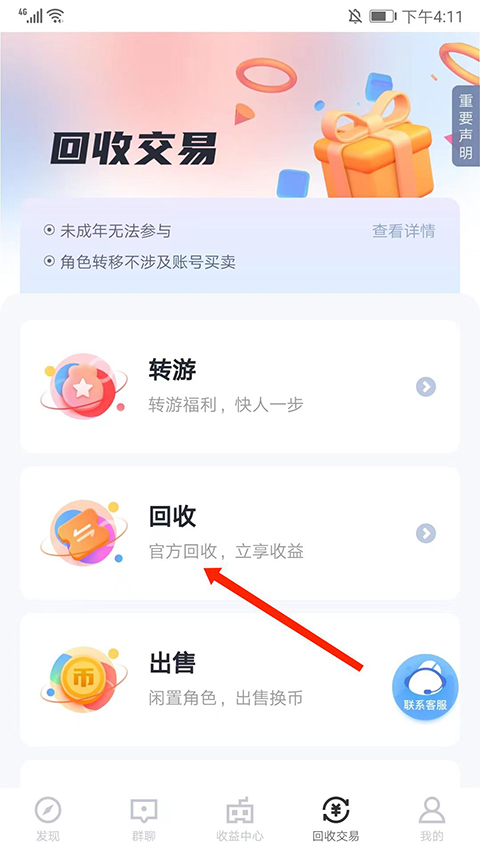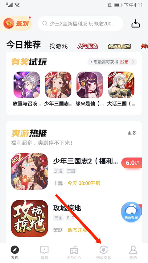 1、打开66折扣手游app,选择下方【回收交易】选项,