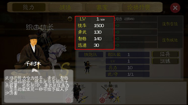 武将的能力又分为统率、勇武、智略、迅速四部分,统率是可率领的士兵数量,也就是所谓的血量;勇武是攻击力,显示的数值是一秒给予敌人的伤害;智略在合战中则表示防御力,除了可以减轻敌人对你的伤害,还能作用在外交工作上;迅速是合战中的移动速度。