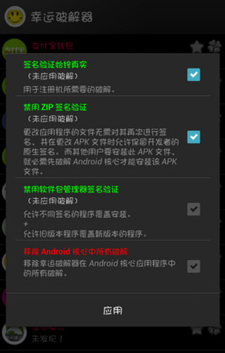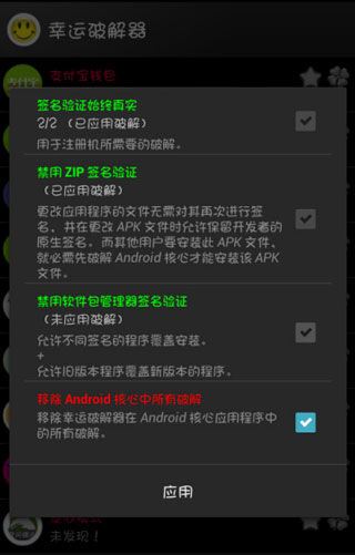 4、重启下手机,再打开幸运破解器的核心破解,勾“移除 Android 核心中所有破解”,按“应用”重启。