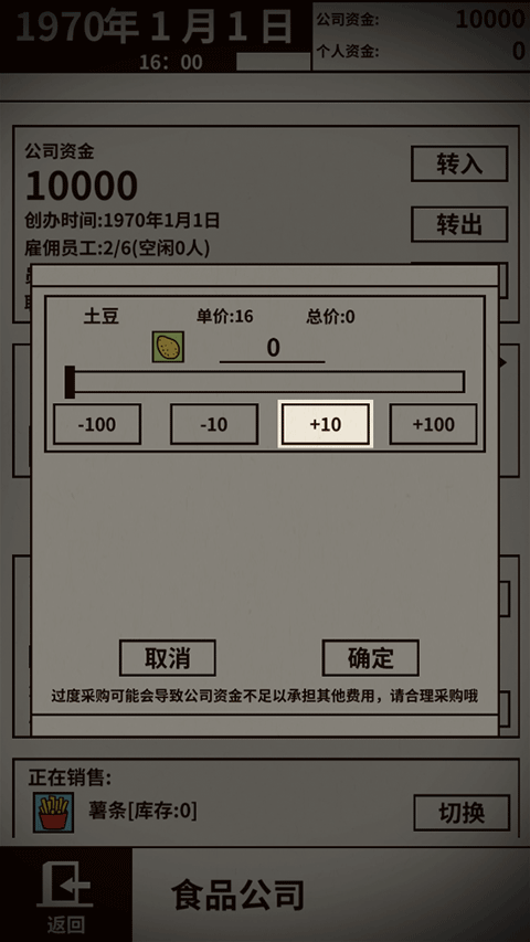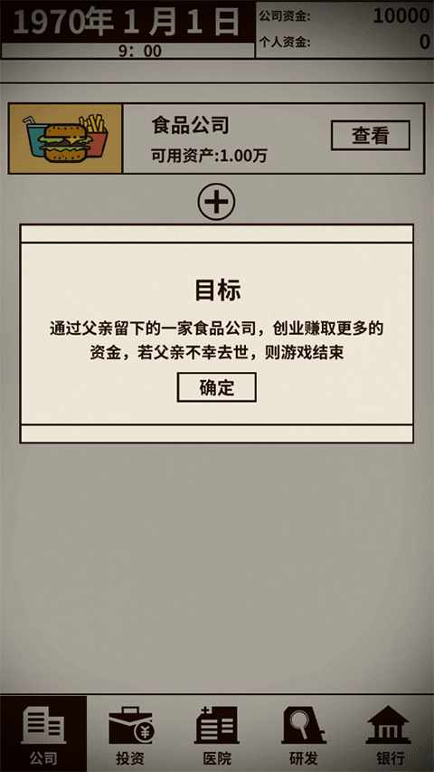 1、进入游戏,游戏,目标为通过经营父亲留下的一家食品公司,创业赚取更多的资金,若父亲不幸去世,则游戏结束;
