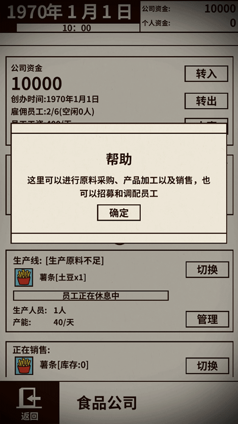2、点击查看,在这里可以进行原料采购、产品加工以及销售,也可以招募和调配员工。