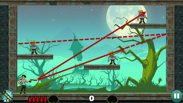 过关的主要技巧就是利用墙壁的反弹和箱子压死僵尸,反弹的位置不好找,这个可以多试几次。在一发子弹没有消失的时候不要打出第二发,万一第一发子弹经过反弹可以杀其他僵尸,这样就造成失误的判断了。如果感觉自己瞄不准可以找个直线的东西比在手机上,这样就可以有个实物的辅助工具了。实在过不去哪一关的情况下可以使用左下角的技能,一个技能轰死所有的僵尸。