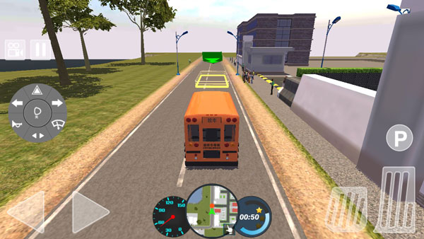 2、完成时候,就如图下所示,在这里玩家可自由操控校车开始驾驶模拟,待进入到黄色方框中后,便可选择打开车门,让学生上车,待完成后,关闭车门,开始完全接送。