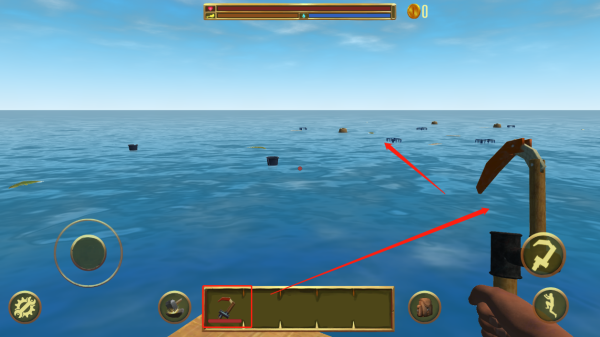 2、进入游戏之后你会出现在一块浮木上,这个时候就可以通过工具打捞海上飘荡的物品,制作以供生存的工具了哦。