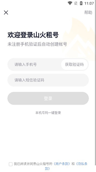 1、下载安装本站提供的山火租号app,进入之后需要同意用户协议;