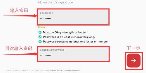 然后创建你登陆游戏的密码,需要输入两次(建议使用英文和数字结合,更容易被系统认可),游戏登陆密码,一定要记得!
