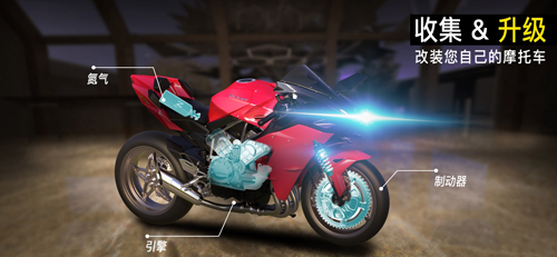 3、为优秀的摩托车手除了必要的冒险精神外,炫酷的摩托车也是不可或缺的!我们车库中拥有大量炫酷的摩托车,来自世界各地的车型。升级,改造的玩法也让这场在手掌中的荣耀之战变得奇妙无比。