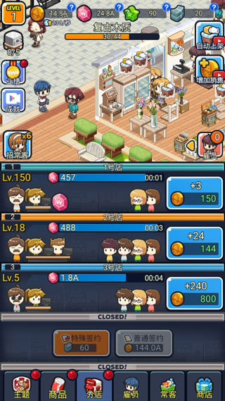 游戏玩法:对于这款休闲有趣放置模拟游戏来说,其实在玩法上并没有什么难度,主要就是通过打造新的主题格局,管理销售商品的价格,开设分店和雇佣员工等方面构成。