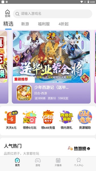 1、下载并安装软件,进入首页选择你要体验的游戏,在首页的展示中有领券0元玩、领648充值、领内测礼以及资源辅助。