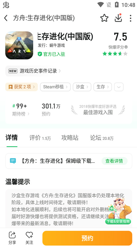 为了让玩家能找到更好的游戏,爆米花游戏盒app还详细了罗列了游戏的预览、试玩视频、游戏信息、官方公告、标签、简介、获奖情况评分评价、安利列表等等,甚至还有攻略工具、爆料、玩家视频、教学百科、互动问答等,针对特定现象级手游还针对性地增加了许多有趣的内容模块供玩家探索。这里小编就以“吃鸡”手游《刺激战场》为例,在小编体验过程中足足有17个专区分类入口,更何况市面上其他热门游戏,可以说是应有尽有,这样最大程度的满足用户找到好游戏的需求了。