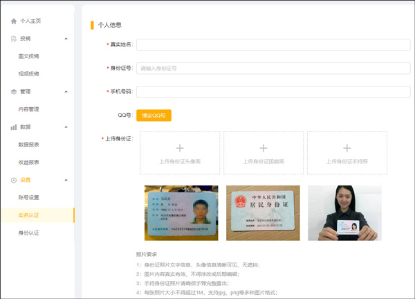 7、注意填写的信息都是要真实的,而且还需要上传自己的身份证,除了内容作者以外,其他认证都需要证明的。