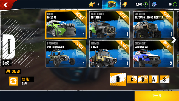 5、调整好自己车辆的性能之后,点击下一步开始游戏;
