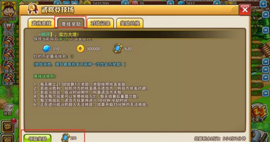 3、武将竞技场每天晚上21:00结算,按照竞技排名发放奖励。挑战获胜,提升最高排名可获得一次性金币奖励。