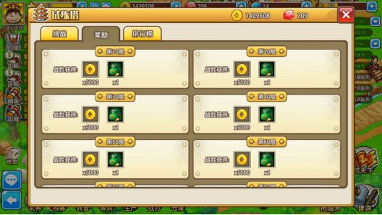 5、每10层会获得金币、宝石奖励。每天可以免费领取一次从第1层至当前层的所有奖励,另外还可以花费红钻再领一次。