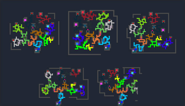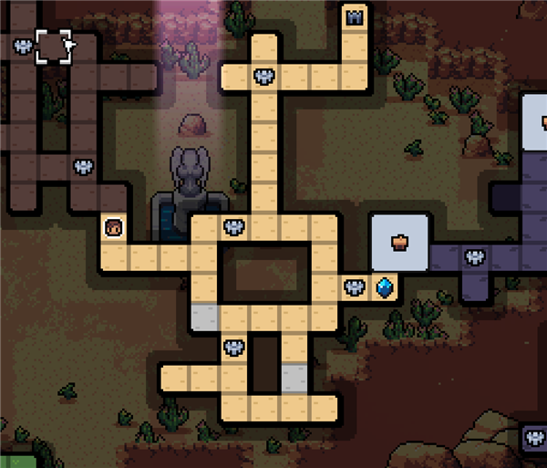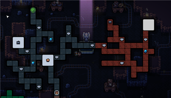 游戏每次开始都会重新生成一种整体构造的大地图,大多数格子会是野外,野外可以打怪,获得素材,积累金币,玩家可以自由的在这里穿梭,不同颜色代表了不同的生物群落,比如白色是雪山,绿色是丛林,黑色是洞穴。