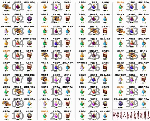 以下这张图是神秘商店每天的具体售卖的魔法物品的图表: