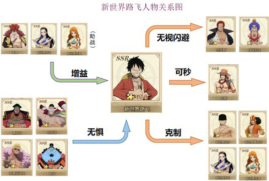 新世界路飞,有两个强力的输出技能【猿王群鸦炮】【大猿王枪】,并且自身有一定的暴击加成,他的暴力输出非常克制脆皮角色。另外【大猿王枪】有着必定命中的强力效果,对于所有的高闪避角色都可以稳定输出!可以说是完全克制了闪避流角色。但也有能够克制他的角色。比如带有锁血的角色,新世界路飞秒不掉,另外新世界路飞的输出依赖于奥义,所以如果在释放奥义前遇到白胡子是比较容易被打断的,如果被打断的情况下,新世界路飞的奥义在首回合就无法释放,将对战局带来影响。