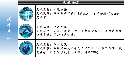新世界罗的天赋大致可以分成两部分:心脏摘除&战斗基础。心脏,作为人体最重要的器官,“心脏摘除”必将对目标敌人造成难以弥补的伤害!这套机制简单来说,使得敌我双方两名角色产生关联,增强己方削弱敌方,在本方角色受到致命伤害时,敌方关联者同样受到致命伤害,并回复“始作俑者”新世界罗的血量并增加5魂玉。