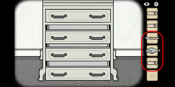 3、打开抽屉,第二格是小刀,第三格是一条鱼,第四格是第三支蜡烛;