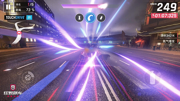在这款游戏中,比赛是的一些细节做得非常不错,尤其是碰撞的时候,系统会给出慢放镜头供玩家欣赏。不过最喜欢的就是氮气加速时的效果,普通氮气和完美氮气都没有什么特殊的效果。唯独氮气爆发,在点击触发的时候,就像是在赛车前开了一个穿越的虫洞一般,在赛车奔跑时,紫色炫彩的流动线条,给玩家不一样的视觉体验。