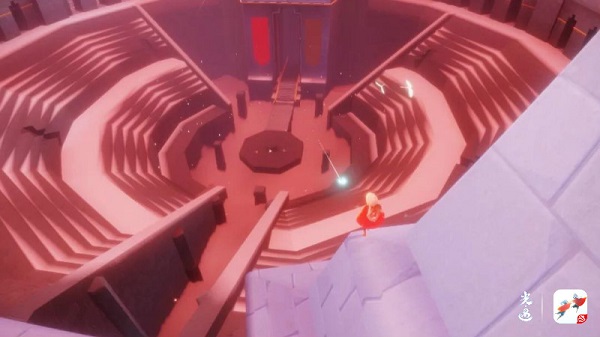 竞速比赛的终点站是“落日竞技场”。庄严高大的圆形竞技场中间是象征着胜者荣耀的中心台。旅人们只要完成竞速比赛,就可以获得两根蜡烛作为嘉奖(每日仅可获取一次)。在通往神庙的台阶上,有两处灯柱,点燃后即可放出庆贺烟花。