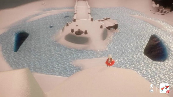 从霞谷的小广场一跃而下,顺着光滑的冰面、狭长的冰道快速前进,不久后就会来到冰上世界。这里是由厚厚的湖面冰层形成的滑冰场,旅人可以在这里体验滑冰的快乐。冰面深蓝色的部分则是露出的地下冰湖,旅人们可以进入冰湖底一探究竟。