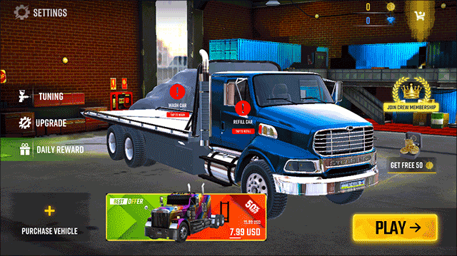 在此你可以解锁其他各类卡车,每辆车子的速度、处理方式、加速度和制动效果都各有不同属性,切换使用,好让你的驾驶模拟效果变得更佳。喜欢卡车类游戏的玩家,一定不要错过体验这款模拟卡车司机的游戏了。