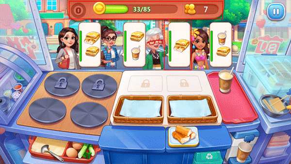 1、开局顾客走到摊子前有较长一段时间,直接快速点击食材把炉子拉满,基本上等顾客到了,煎饼就出炉了。 2、除了有不让丢和不让糊要求的关卡,我推荐一直将煎饼制作保持在2~3炉(具体几炉看手速),这里有5个原因:这样可以更快地卖出煎饼、每一位顾客最多提出3个要求、食材熟的程度只要不全糊顾客无所谓、食材糊了丢弃即可、使用食材没有成本并不消耗金币。