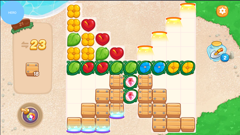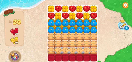 (2) 消除大部分箱子露出红色的蝴蝶发生器后,减少炸弹的使用,消除除红色以外的元素让红色元素得以掉落生成蝴蝶。