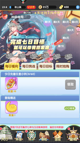 主公通过完成七日福利活动可获得海量道具奖励;