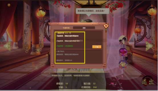 红颜属性分为亲密度和魅力值,亲密度可以解锁红颜的技能,技能可以大量提升相应门客的属性。魅力值可以增加每次宠幸获得的红颜经验,红颜经验能够提升红颜的技能等级。提升属性需要使用道具才能提升。