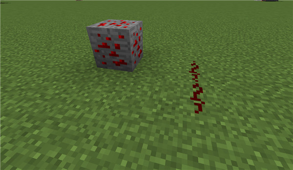 左边的矿物是红石矿,开采后可以获得数个红石,红石放置在地上之后就会形成红石线路。要注意的是,红石矿在开采的时候会出现自然发亮现象,不必惊慌,我们开采红石矿的工具至少为铁质的。
