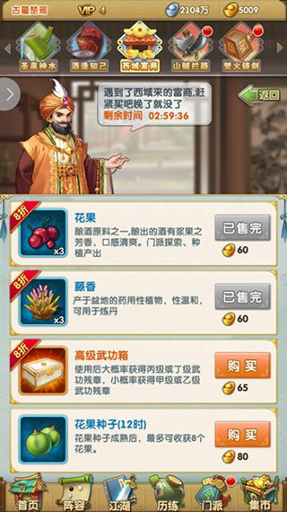 在门派探索中,会出现一些奇遇事件,而有些奇遇事件需要消耗一些元宝;比如“西域富商”一般会携带种子、药草、粮食、丹药配方、高级武功箱等,这其中的药草和粮食一定是要买的。