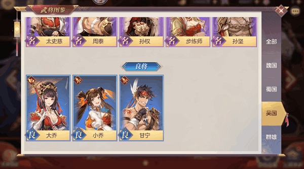 适合和其他势力混搭的武将:甘宁、孙尚香。吴国武将之间搭配才是最强的,因此能出去和其他阵容搭配的只有甘宁和孙尚香(女队)了。