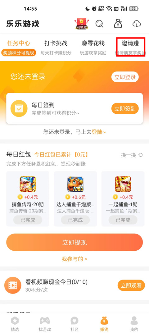 6、如果你觉得玩游戏没意思,那么赚钱肯定就是你继续用这款软件的动力,点开赚钱页面,完成平台的任务可以获得相应的奖励。