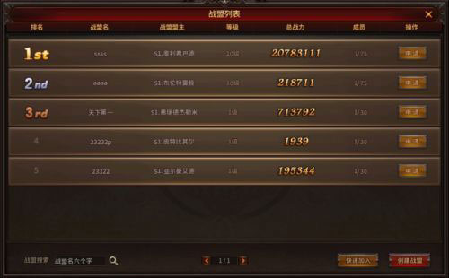在战盟界面中,可以看到当前服务器已有的全部战盟,列表中会显示战盟名称、战盟等级和战盟人数等,列表中按照战盟等级进行排序。