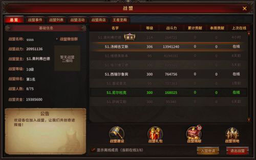 当玩家加入战盟后,在战盟主界面左侧可以看到战盟的各类信息,包括战盟名称、战盟战力、战盟等级、战盟排名、战盟人数、战盟资金和战盟公告等,还有战盟建立的专属群。