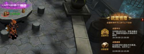 通过战盟信息界面的“战盟领地”按钮,进入战盟领地地图,战盟领地为一个新的场景,[战盟盛宴]、[战盟传功]活动在战盟领地中进行。