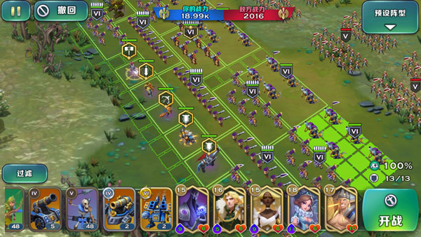 玩家可以对各个兵种进行合理细致的派兵布阵操作和席位细微调整。不同兵种所占的占地面积不同,排列的前后顺序也根据自身特点有所考究。
