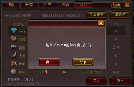 钻石价格要是低就狂买吧!1000多买入 过几天就涨到好几千了,在用金币秒CD出手几十万银票就到手了,轻松不要什么时间。银票只有个几十万就不要换钱了,银票多只会越赚越快。