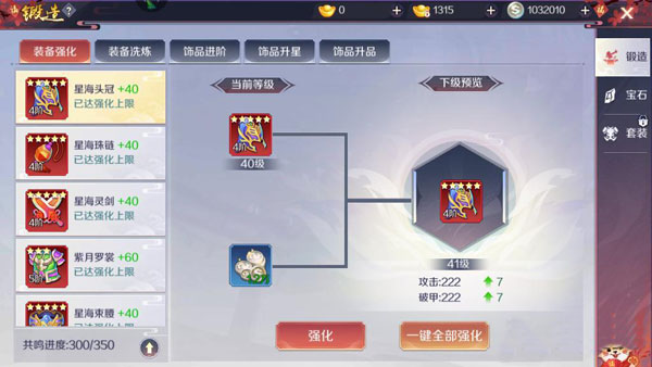 不同的等级在选择装备的时候是有区别的,随着等级的提升,装备的颜色品级和星级都会逐渐的提高。玩家想要获得这些高级装备,BOSS挑战就是比较直接的一个途径。该玩法虽然说会消耗大量的魂力,但是活动和任务都可以获得魂力秘典,可以用来直接恢复魂力值。在得到好的装备之后,可以采用以下几个方式来进行打造。