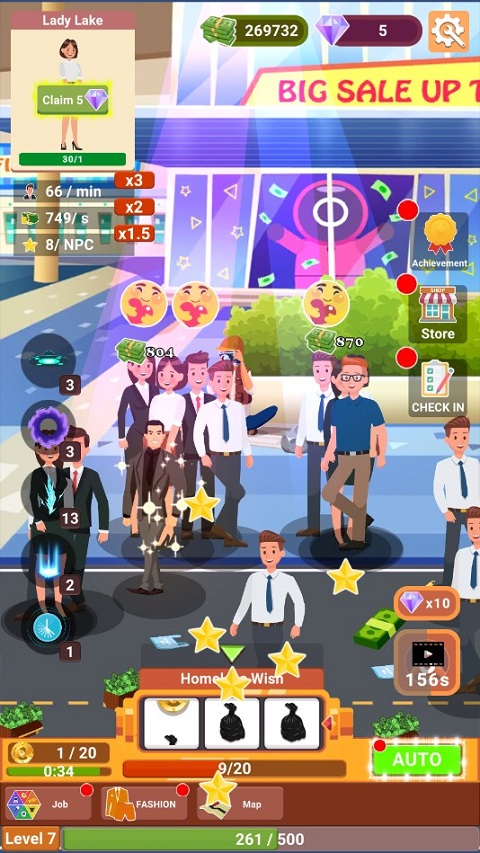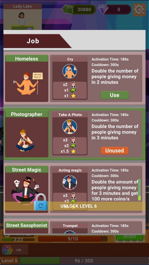 通过升级可以解锁多款套装,套装的更替也会让你赚取更多钱。期间你可以使用技能来吸引更多路人观看你的表演。