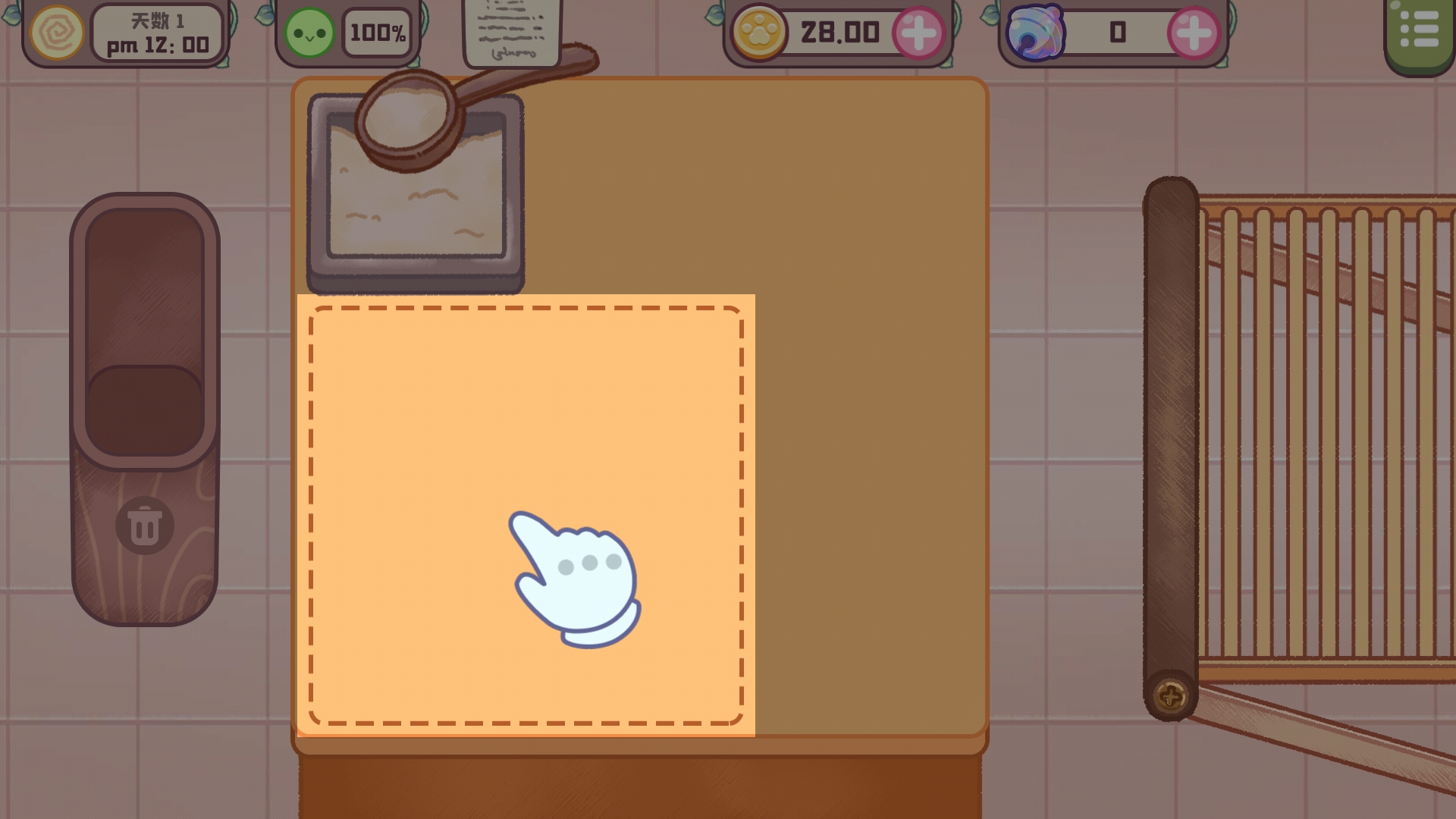 3、跟随系统的引导进入蛋糕制作流程,我们先点击小方盒的面粉,接着点击桌面,