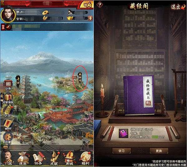 1、爱学习才能进步!大人可以前往藏经阁消耗时间学习新书籍,学习获得的书籍道具可以直接赋予喜爱的门客使用,门客使用后将获得一本全新书籍,实力更加强大!