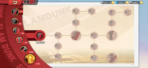 不同玩家的操作习惯不同,选择解锁天赋的顺序也会有很大不同。拿樱木花道来说,技能为:飞人(大招)、飞身篮板、庶民上篮、超级加速、哼哼防守和扑球。
